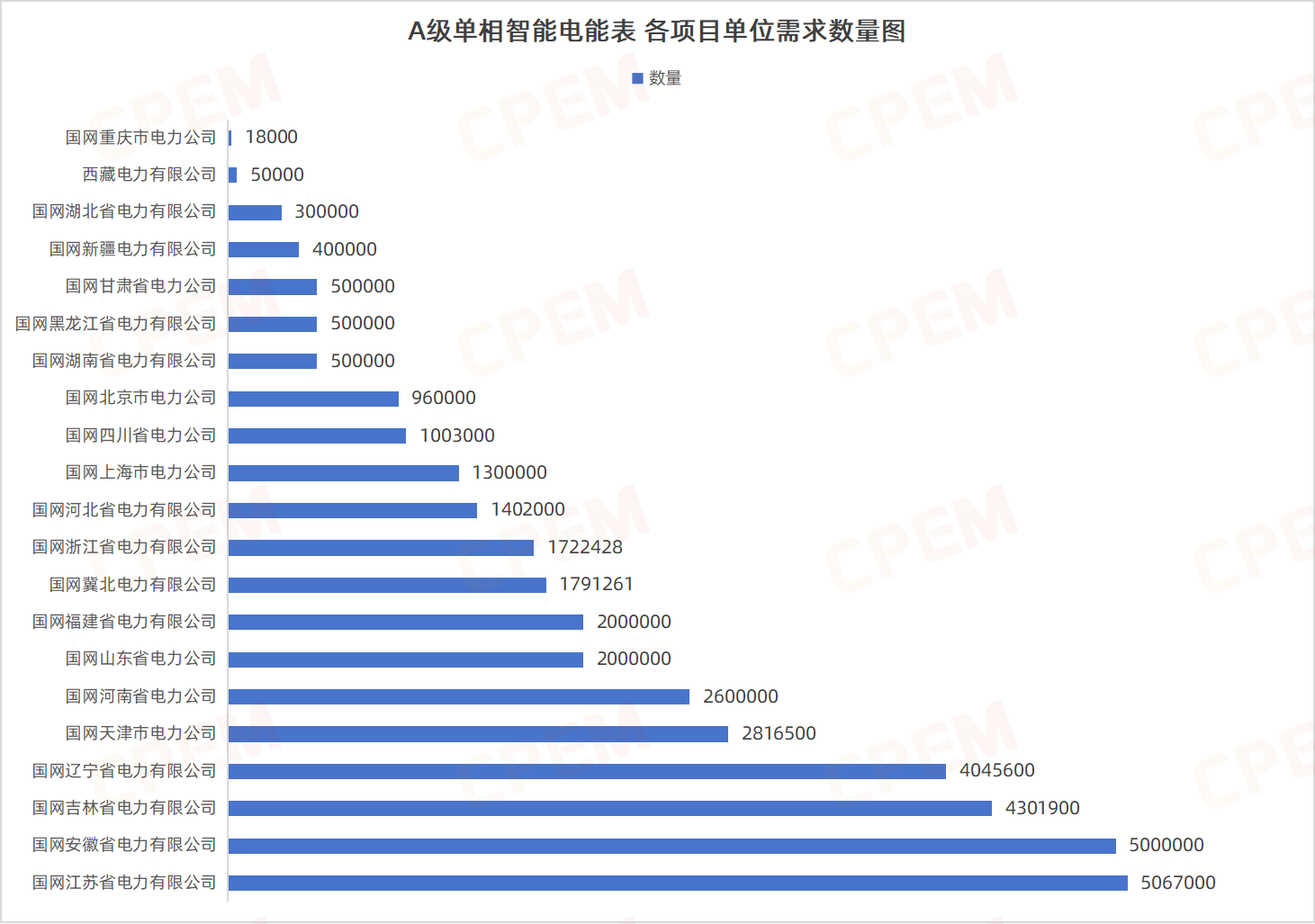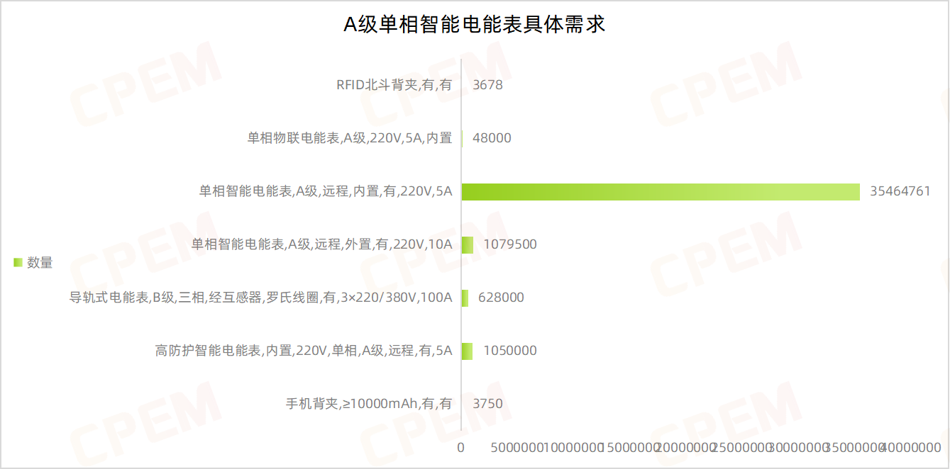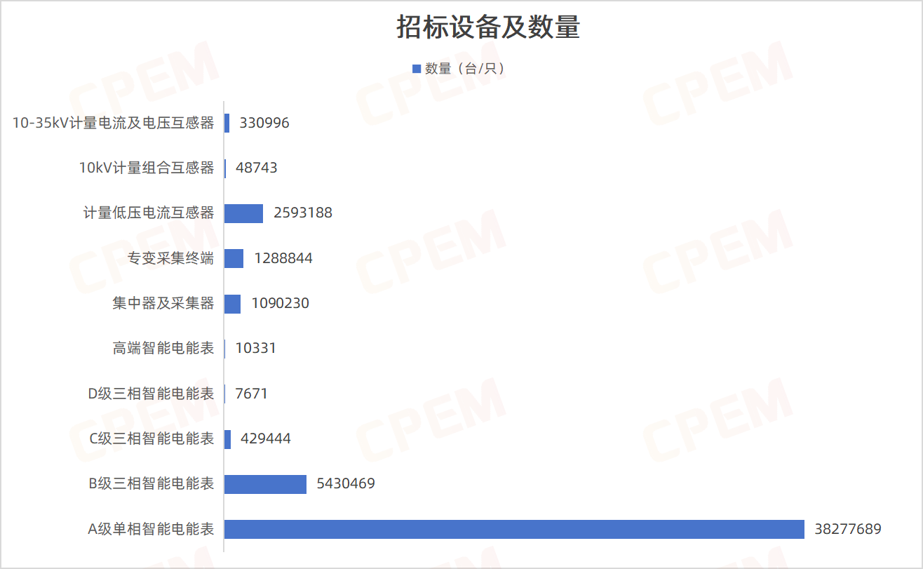 招標(biāo)合計采購設(shè)備49507605臺/只,其中A級單相智能電能表數(shù)量最多,達(dá)38277689臺;其次為B級三相智能電能表,5430469臺。