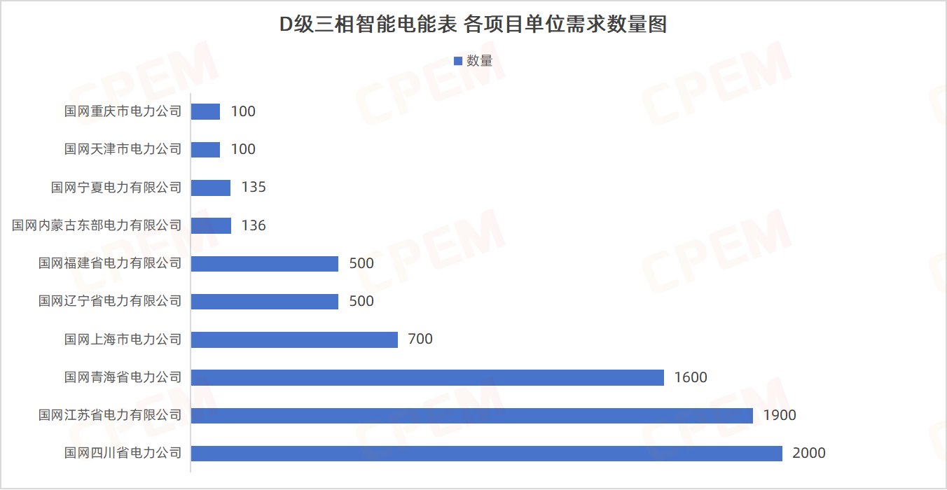 D級三相智能電能表招標(biāo)項目單位共計10個,其中國國網(wǎng)四川省電力公司、國網(wǎng)江蘇省電力有限公司、國網(wǎng)青海省電力公司三個項目單位需求數(shù)量分列前三。D級三相智能電能表下三款產(chǎn)品需求數(shù)比較均衡,其中三相智能電能表,D級,無,無控,無,3×57.7/100V,1.5A該款產(chǎn)品的需求量略高,為2943臺。