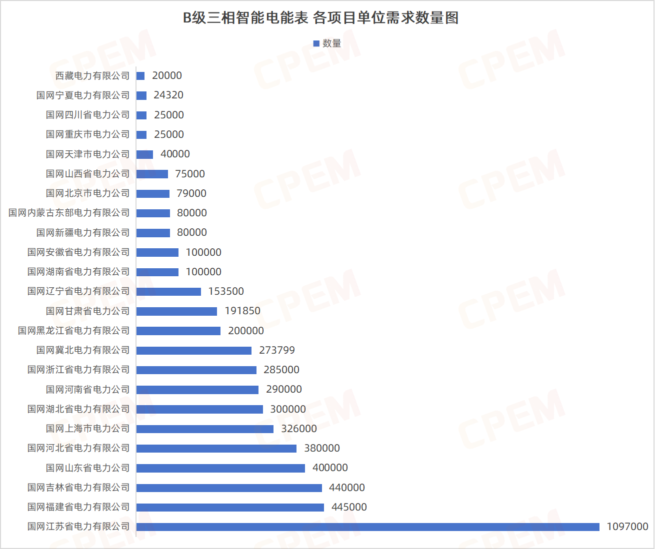 B級三相智能電能表招標(biāo)項目單位共計24個,其中國國網(wǎng)江蘇省電力有限公司、國網(wǎng)福建省電力有限公司、國網(wǎng)吉林省電力有限公司三個項目單位需求數(shù)量分列前三,三相智能電能表,B級,遠(yuǎn)程,內(nèi)置,有,3×220/380V,5A該款產(chǎn)品的需求量最大,達(dá)3215684臺。